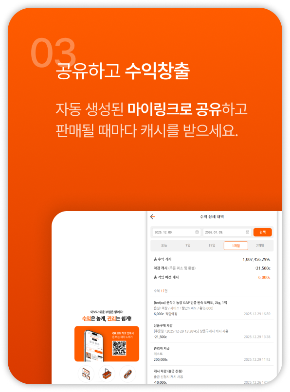 판매 수익은 배송완료 3주 후 보유 캐시에 자동 지급됩니다.